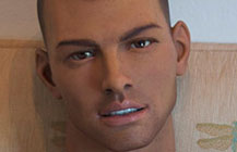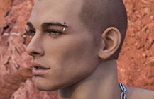 柔和肤色,柔和肤色和游泳裤晒后肤色,胡须茬的脸,金棕色的眼睛,画眉毛,上睫毛,带包皮的软小阴茎,适当的黑色的胸毛,密集的腋毛,中等的阴毛,乳头穿孔,浅黄色手指甲和脚趾甲。